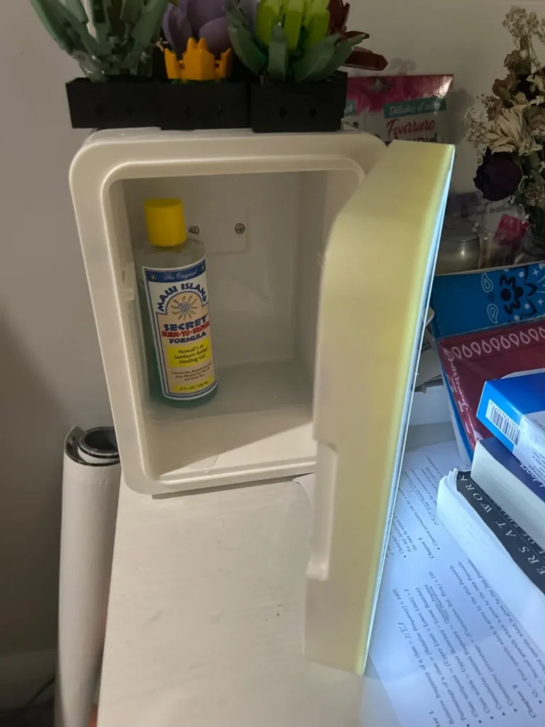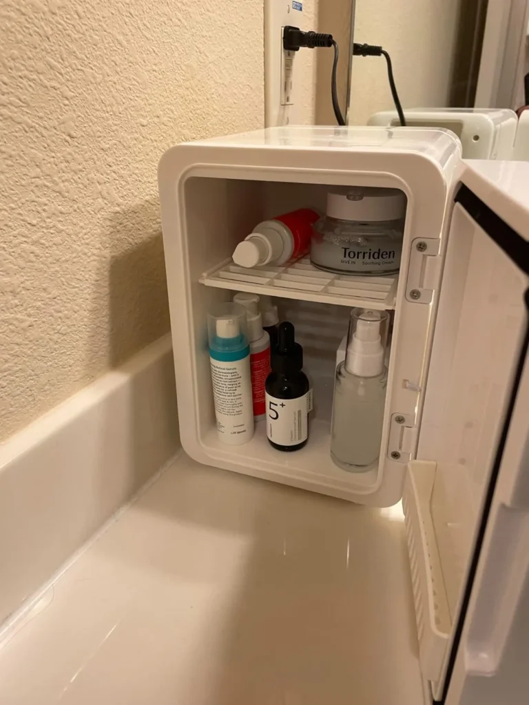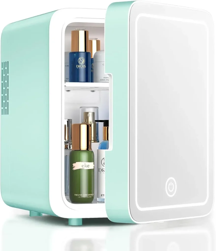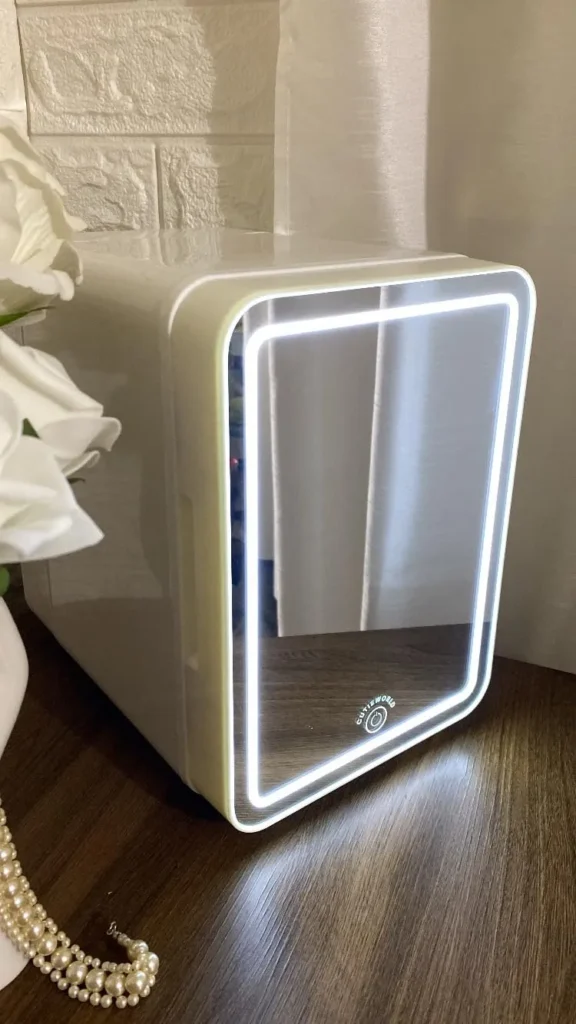 The CUTIEWORLD Makeup Fridge with Dimmable LED Light Mirror is a compact 4-liter mini fridge designed for skincare, cosmetics, and small food items. It’s available in multiple colors, including white, pink, and black, and can be used both in the bedroom and on the go.